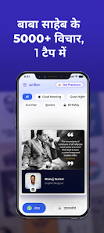 De app 'Jai Bhim: Poster and Ringtone' is ontworpen voor volgers van de Bahujan-beweging, geïnspireerd door figuren zoals Ambedkar en Phule. Gebruikers kunnen gemakkelijk posters en citaten maken, inclusief dagelijkse inspirerende berichten en feestdagposters. Het biedt de mogelijkheid om persoonlijke namen en foto's toe te voegen aan de gemaakte inhoud en deze direct te delen op sociale media platforms zoals WhatsApp, Instagram en Facebook. De app bevat categorieën die relevant zijn voor sociale rechtvaardigheid, gelijkheid en zelfrespect.